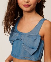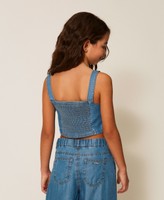 Cropped chambray top with maxi bow at the front. Crew neck, gathered at the centre on the back, side zip fastening, fitted.