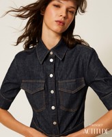 Actitude collection stretch cotton denim shirt. It has short gathered sleeves, logo button fastening, patch flap pockets, tobacco-coloured stitching, fitted.