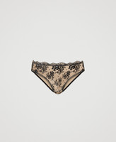 Briefs made from embroidered tulle laminated in front, microfibre on the back, heart-shaped logo with tiny bow on the back.