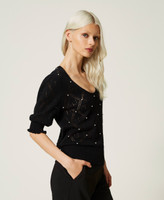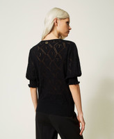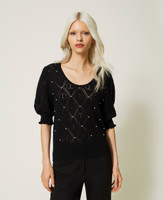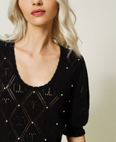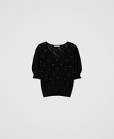 Cashmere and cotton blend jumper with Oval T openwork all over and handmade pearl embroidery, short sleeves, fitted.