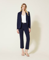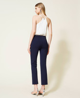 Don’ t miss out these flared fit, stretch Milano stitch cropped trousers, with metal Oval T logo at the waist. Zip and hook side closure and permanent crease. They will be your versatile solution for personalised looks.
