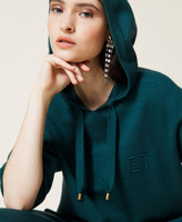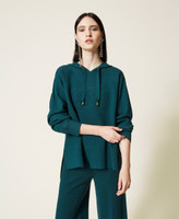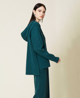 Stretch viscose knit hoodie, drawstring with metal tips, embossed logo.