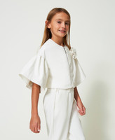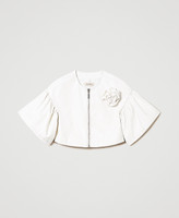 Leather-like jacket with three-quarter sleeves and gathered slouched shoulders, metal zip closure, handmade flower.