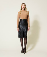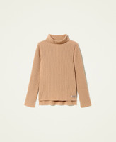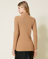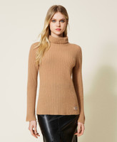 Seamless jumper made from ribbed wool and cashmere blend, with roller neck, slightly flared sleeves, jacquard logo.