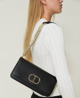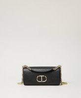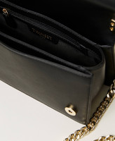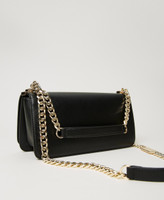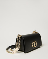 Leather-like shoulder bag with metal Oval T logo, sliding chain shoulder strap with leather-like pads, flap and magnet closure.