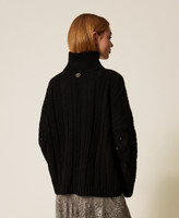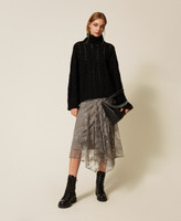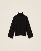 Wool blend jumper with cable knit and open work stitch pattern. High neck, long wide sleeves, ribbed trims, wide fit.