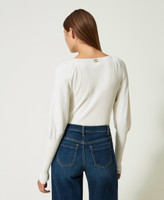 Minimalist elegance for this jumper made in Italy from stretch viscose, with round neck, long sleeves with gathering and ribbed cuffs, Oval T logo plate with rhinestones on the back. Fitted volume to complete all your look with a contemporary touch.