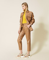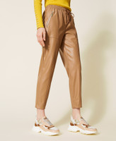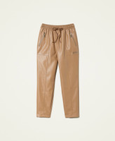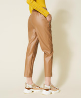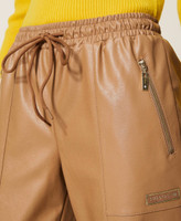 Leather effect trousers with elasticated waist and drawstring, zipped pockets, ribbing in front, loose fit.