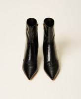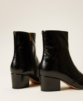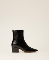 Faux polished leather ankle boots with tapered toe, inner zip fastening, chunky heel, tunit sole.