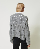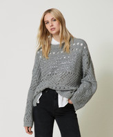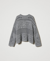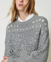 Jumper made from viscose, wool and cotton blend with punched openwork that creates different patterns, sequin embroidery at the centre, round neck, long sleeves, ribbed trims, Oval T logo plate at the back, loose fit.
