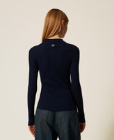Pure wool turtle neck jumper with rib knit and open work stitch pattern, long sleeves, Oval T logo plate on the back, fitted.