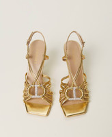 Cage sandals with weaved Oval T in front, strap with buckle, square toe, tunit sole.