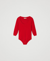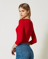 Seamless stretch viscose knit bodysuit with wide round neckline, three-quarter sleeves, fitted.