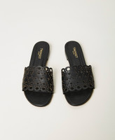 Elevate your style with these leather slides with decorative lasered motifs on the band and tunit sole. Perfect for adding a sophisticated note to short-and-top outfits.