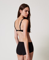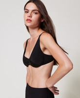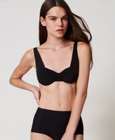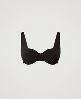 Non-padded ruched underwire bikini top with wide shoulder straps for better support and back self-tie. Lined.
