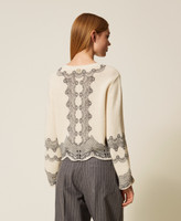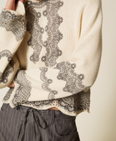 Wool and cotton blend jumper with placed print. Round neck, long flared sleeves, scalloped open stitch hem, Oval T logo plate on the back, wide fit.