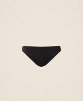Double-layered fabric bikini bottom with wide sides and heart-shaped metal logo on the back.