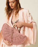 Shell-shaped shoulder bag made from hand-woven crochet cellulose raffia. Double brass-tone jewel torchon handle with logo, removable chain cross-body strap, matching lining. Customised with logoed metal charm.