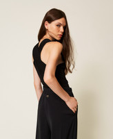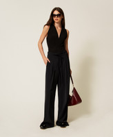 Viscose blend knit bodysuit with pleated crossover at the front. V neck, seam at the waist, Oval T logo plate on the back, fitted.