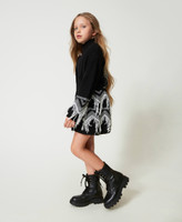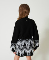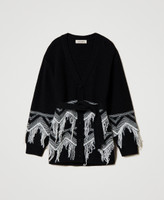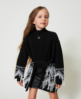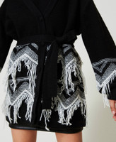 Abrigo de niña confeccionado con punto raso de mezcla de lana con estampado geométrico de color a contraste y flecos. Muestra un escote de pico, cierre de botones forrados, manga larga, cinturón extraíble a juego, placa metálica con el logo en la parte trasera y corte holgado.