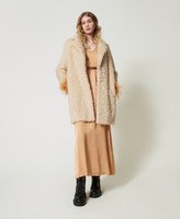 Abrigo midi de pelo sintético con textura de astracán, cuello con solapas, cierre de botones a presión ocultos, manga larga, bolsillos laterales, forro y corte holgado.