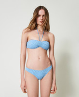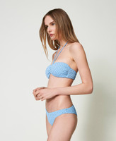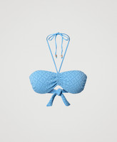 Banda de baño con bordado inglés, acolchada con copas extraíbles, varillas laterales, centro de las copas ajustable con lazos, forrada.