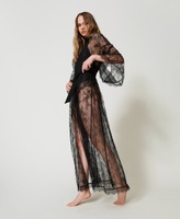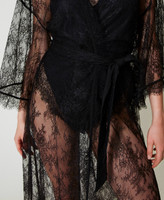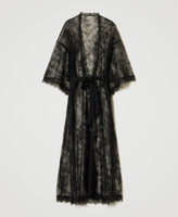 Bata larga de encaje festoneado con ribete de crepé de China. Tiene mangas kimono con aberturas, cinturón extraíble de encaje y crepé de China y corte holgado.