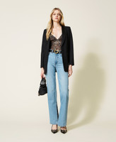 El body de encaje elástico Valenciennes con diseño floral está listo para acompañarte en tus salidas nocturnas. Tiene escote de pico y tirantes de encaje festoneado, la parte superior está entretelada en tul de color nude, el resto transparente y tiene la placa del logotipo Oval T en la parte posterior. Con blazer y vaqueros también para un look diario de carácter.