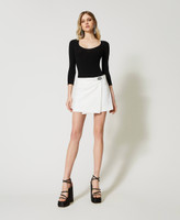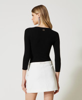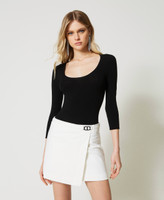 Base perfecta para multitud de looks. Elige el body made in Italy de punto de viscosa elástica sin costuras con amplio escote, mangas de tres cuartos, ribetes rematados de canalé y placa con logotipo Oval T con strass en la parte posterior. Será perfecto con pantalones y faldas de talle alto.