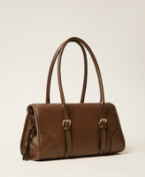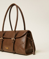 Bolso con efecto de piel de becerro semibrillante con aspecto ligeramente ondulado en la superficie. Presenta un cierre con solapa e imán, asas tubulares de mano y hombro ajustables mediante hebillas, frunces laterales con cordones anudados que aportan movimiento y logotipo con letras de metal de color dorado en el cuadrante delantero. Forrado y con bolsillos internos.