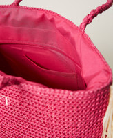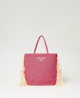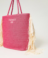 Bolso shopper efecto rafia con flecos laterales, doble asa trenzada, logotipo bordado en contraste, forrada.
