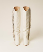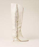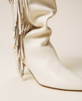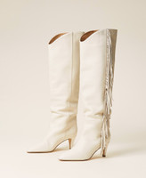Botas altas de piel con flecos laterales, punta afilada, caña de tubo y suela de cuero.