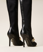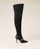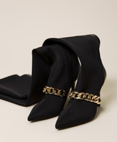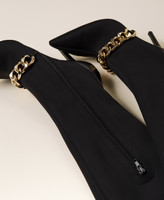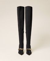 Botas mosqueteras de tejido elástico con punta afilada, cadena dorada y cremallera interna.