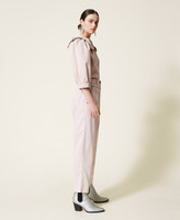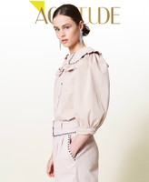 Femineidad rompedora para la camisa 'Platinum', en bull ligero de algodón teñido en prenda, con maxicuello camisero rematado con volante y tachuelas redondas de color gris plomo. Mangas tres cuartos amplias y fruncidas y cierre con botones metálicos de cabeza plana.