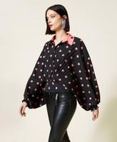 Volumen inesperado para la camisa en crepé de China estampado de lunares con elaboración plisada y cenefa lisa en el bajo cerrada con botones. Tiene el cuello en color en contraste, mangas largas con bordado elástico en los puños y cierre con botones forrados. Dará carácter a los conjuntos durante 24 horas.