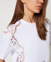 Camiseta de punto de algodón con bordado inglés posicionado en los hombros, los laterales y el bajo. Presenta un cuello redondo, manga corta, bajo festoneado, placa con logotipo Oval T en la parte trasera y corte recto.