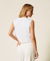 Camiseta de punto de puro algodón con bordado inglés insertado en bandas diagonales. Presenta cuello redondo, placa con el logotipo en la parte trasera y corte regular.