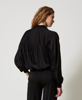 Cazadora bómber de raso de algodón con manga kimono. Patrón fruncido bajo el canesú trasero. Cuello bómber, bajo y puños de canalé y cierre de cremallera central.