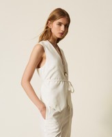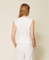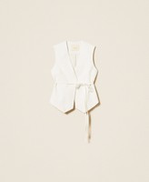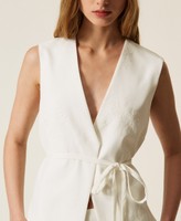 Chaleco bordado en mezcla de viscosa con un 63 % de poliéster reciclado posconsumo certificado. Tiene escote de pico, cierre con cinturón extraíble a juego, forro y corte holgado. Las microimpurezas son propias de los materiales reciclados. Este artículo forma parte de la selección «Archive», inspirada en las prendas más icónicas y admiradas de las colecciones de Twinset.