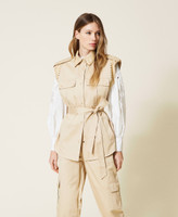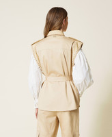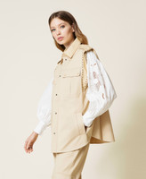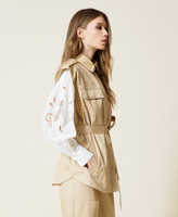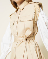 Acabados sofisticados para este chaleco confeccionado en drill de algodón adornado con bordados perforados con láser y vivos festoneados. Presenta un corte holgado que podrás regular con un cinturón desmontable a juego, cuello camisero, alamares y sisa de tejido encerado a juego, bolsillos con cartera en la parte superior e inserciones en la inferior y cierre con cremallera cubierta con solapa cortavientos con botones automáticos. Para que lo combines como quieras y otorgues un toque actual a tus atuendos.