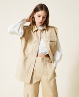 Chaleco confeccionado en drill de algodón con bordados perforados con láser, vivos festoneados, inserciones de tejido festoneado y botones automáticos.
