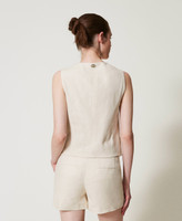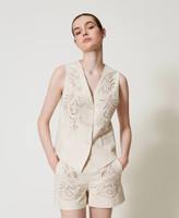 Chaleco de tejido plano con textura de tela de lino y viscosa, de tacto fluido. Está adornado con un bordado posicionado en hilo a juego, un diseño inspirado en la cachemira en exclusiva para Twinset. Presenta un cuello con solapas, cierre con botones en tono a juego, bolsillos ribeteados en la parte delantera, forro de muselina de algodón, placa con el logotipo Oval T en la parte trasera y corte ajustado.