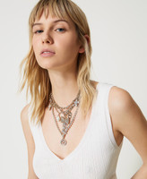 Collar gargantilla multivueltas con mezcla de cadenas, colgantes con cruces, cuentas, lazos y Oval T y cierre con mosquetón.