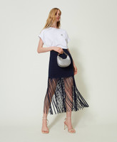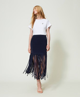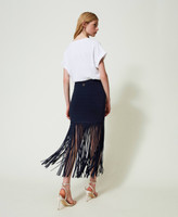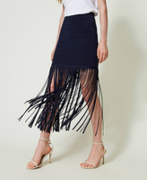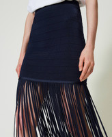Falda corta ceñida de viscosa compacta elástica con ribetes y flecos en el bajo, cintura elástica.