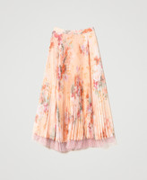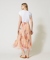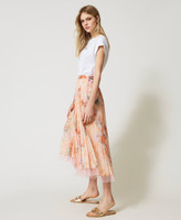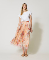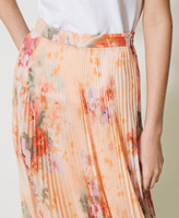 Completa tus conjuntos especiales con esta falda larga de tejido italiano de crepé con estampado exclusivo de Twinset de flores y estrellas. Tiene el volumen amplio gracias a la elaboración de plisado soleil, parte inferior sin rematar, cierre con cremallera invisible en el lateral y forro de georgette. Con top de satén y tacones altos para una elegancia atemporal.