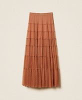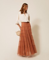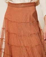 Falda larga de tul plumetis con construcción de volantes, cierre de cremallera en el lateral, forro y corte ancho.