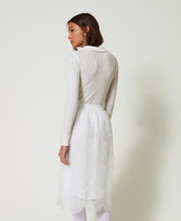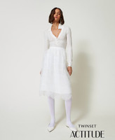 Falda midi de la colección Actitude de organza con bordados all over, bajo festoneado, forro de crepé de China, talle regular, cierre de cremallera trasera y corte évasé.