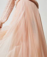 Falda larga de tul con plisado soleil con cremallera oculta en el lateral, forro de crepé de China y corte évasé.
