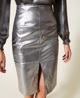Falda midi efecto piel con encerado de lámina de plata, talle alto, cremallera metálica y con forro.