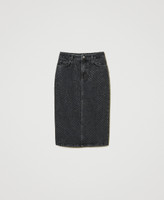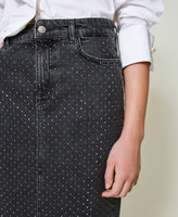 Falda midi de la colección Actitude de denim negro con manchas de color y apliques de strass a tono all over en la parte delantera, talle regular, cierre de cremallera y botón, cinco bolsillos, amplia abertura en la parte central trasera y corte ceñido.